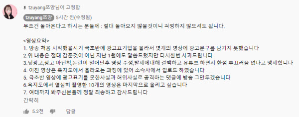이처럼 자신의 유튜브 채널에 영상으로 은퇴를 선언한 쯔양은 우선 광고 관련 논란에 대해서는 "방송 극 초반 몇개의 영상에 광고 표기를 하지 않았으며 이는 명백하게 잘못된 바이며 사과한다"고 했습니다. 또한 "빵송을 처음 시작한 후 짧은 기간 동안 유튜브 관련 지침에 대해 지키지 못했다며 유튜브를 제대로 공부하지 못한 내 잘못"이라며 시인했습니다.