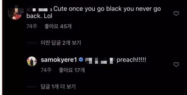 여기까지라면 참 좋았겠지만 이 사진에 한 네티즌이 "Cute. once you go black, you never goback. Lol"이라고 댓글을 남겼고 이에 샘 오취리는 "Preach"라고 답했습니다.