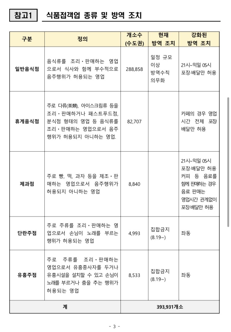 이번 조치에 따라 수도권 소재의 38만여 개의 음식점과 제과점, 6만 3천여 개의 학원, 2만 8천여 개의 실내 체육시설 등이 영향을 받게 됩니다. 3단계가 아니어도 자영업자 등 많은 희생과 피해가 이미 발생하고 있고, 더 발생할 것으로 예상됩니다.
