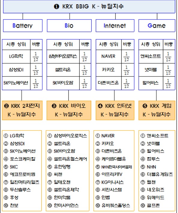 배터리·바이오·인터넷·게임 'BBIG'이라고 불리는 4개 업종을 기반으로 섹터별 시가총액 상위 3곳, 12개 종목이 지수를 구성하고 있습니다. 지수는 각 종목의 비중을 12분의 1씩 동일하게 두고 산출했습니다. 2차전지·바이오·인터넷·게임 섹터별 K-뉴딜지수도 함께 내놨는데요. 이들 지수에도 산업군 내에서 시총 상위 10개 종목이 각각 편입됩니다.
