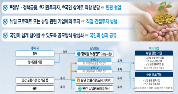 정부 주도로 뉴딜정책(디지털뉴딜, 그린뉴딜) 관련 민간기업에 투자하는 것으로 일반투자자까지 투자할 수 있는데 원금 보장이 가능한(그렇게 홍보 중) 상품입니다. 하지만 펀드가 원금보장을 한다는 것 자체가 자본시장에 위배되기 때문에 손실을 세금으로 메꾸는 것이 아니냐는 비판에 당면해있습니다.