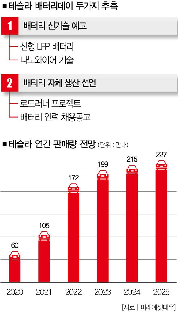 테슬라의 전기차 판매량은 2020년 60만대, 2021년 105만대, 2022년 172만대로 급격히 늘어날 전망인데, 자체 생산만으론 배터리 수요를 감당하기 어렵기 때문입니다.