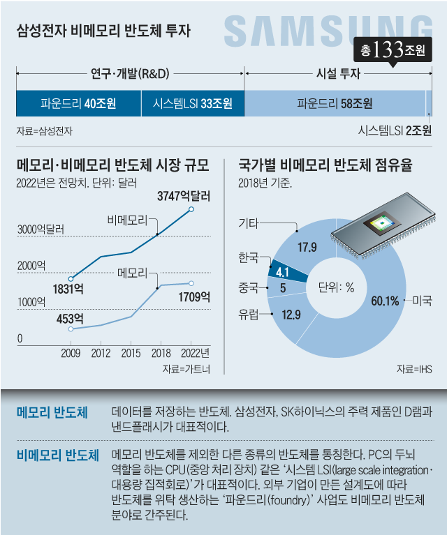 자율주행 등의 산업이 가까워질수록 반도체도 고도화한 기술이 필요하며, 이에 가장 필요한 반도체는 바로 '비메모리 반도체'인 것입니다. 삼성전자가 133조를 비메모리반도체 분야에 투자하며 주력하고 있는 것도 이에 대한 반증이기도 합니다.