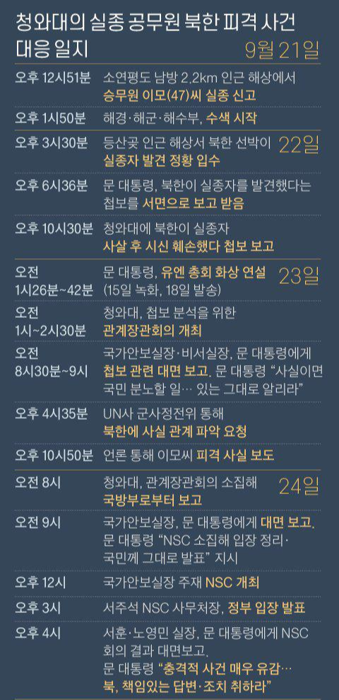 이후 4시간 남짓 지난 오후 10시 30분, 청와대는 '북한이 월북 의사를 밝힌 A씨를 사살한 뒤 시신을 훼손했다'는 첩보를 입수했으며, 23일 새벽 1시∼2시 30분 노영민 대통령 비서실장, 서훈 국가안보실장, 이인영 통일부 장관, 서욱 국방부 장관, 박지원 국가정보원장 등이 청와대에 모여 상황을 공유했습니다.