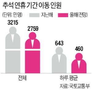 한국교통연구원이 총 1만3806가구를 대상으로 실시한 ‘추석 연휴 통행실태조사’에 따르면 추석 특별교통대책기간(9월 29일~10월 4일) 동안 총 이동 인원은 2759만 명으로 예측됐습니다. 하루 평균 이동 인원은 460만 명으로 지난해 총 이동 인원(3215만 명)보다 14.2%, 하루 평균 이동 인원(643만 명)보다 28.5% 줄어든 것이다. 추석 당일인 다음달 1일에는 최대 618만 명이 이동할 전망입니다.