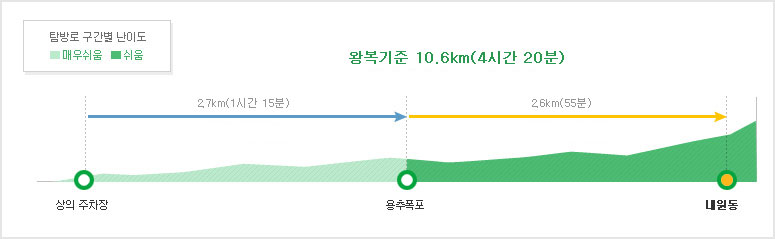 상의주차장에서 용추폭포, 절구폭포, 용연폭포, 내원동 옛 터를 탐방하는 코스(5.3km, 2시간 10분 소요)