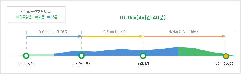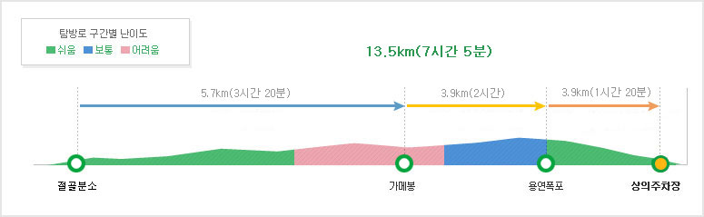 상의 주차장에서 용추폭포, 용연폭포, 후리메기 삼거리, 가메봉을 거치는 탐방코스(7.2km 4시간 5분 소요)