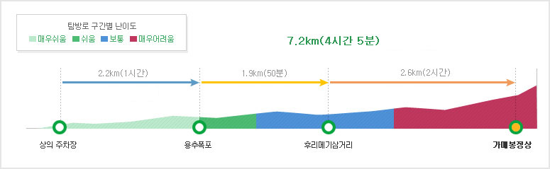상의 주차장에서 용추폭포, 용연폭포, 후리메기 삼거리, 가메봉을 거치는 탐방코스(7.2km 4시간 5분 소요)