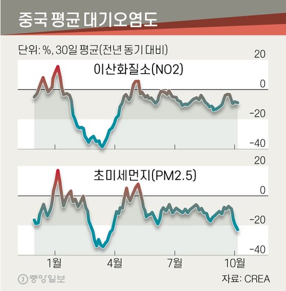 에너지청정대기연구센터(CREA)에 따르면, 중국의 이산화질소(NO2) 배출량은 코로나19 이후 전년 대비 40% 가까이 떨어졌다가 여름철부터 다시 예년 수준을 회복했는데요. 이산화질소는 미세먼지를 만드는 대기오염물질 중 하나로, 초미세먼지(PM2.5)의 원인으로 지목되며 초미세먼지 농도 역시 지난해보다는 다소 낮지만, 봉쇄 시기보다는 높은 수준을 보이고 있습니다.