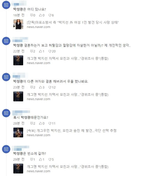 이런 장면을 기억하는 네티즌 중 몇몇 악플러들은 박 씨의 사망 원인이 박성광의 결혼 때문이라고 주장하는 악성 댓글이 달리고 있는 것입니다. 또 다른 악플러들은 박지선의 마음을 받아주지 않았다는 이유로 박성광을 비난하는 내용의 댓글도 남기기도 했습니다.