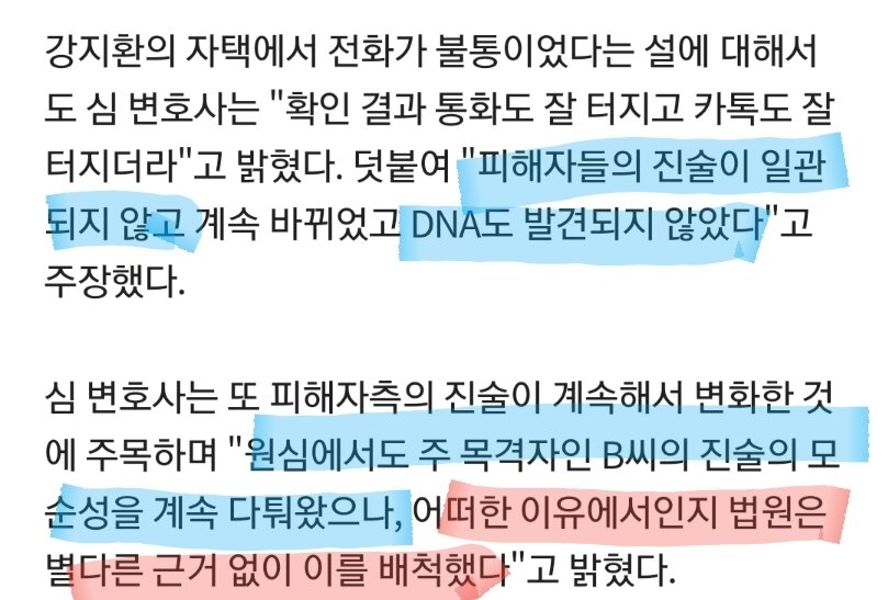 준강간 피해자 A의 신체에서는 강지환의 정액이나 쿠퍼액이 전혀 발견되지 않았으며 피해자들의 진술 변화 또한 음부를 만졌고 손을 피해자의 성기에 삽입했다는 내용에서 하복부를 툭툭 쳤다는 내용으로 바뀌귀도 했습니다.