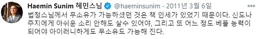 혜민 스님은 지난 2011년 트위터를 통해 "법정 스님께서 무소유가 가능하셨던 것은 책 인세가 있었기 때문이다"고 주장했죠