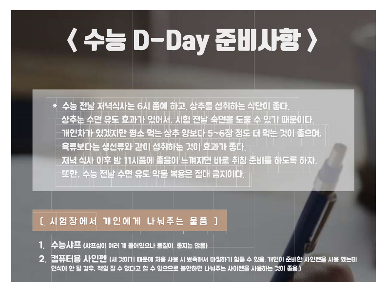 우리 고3 여러분들이 코로나 시국에서도 온전한 실력을 발휘하기 위하여 오늘은 수능시험 때 준비해야할 사항들을 정리해보았습니다.