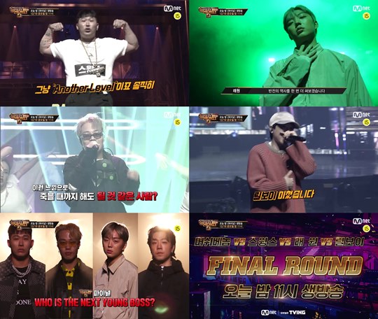 지난주 세미파이널 경연을 통해 톱(TOP)4로 선정된 머쉬베놈, 스윙스, 래원, 릴보이가 한국 힙합 씬의 새로운 주인공으로 등극할 '영 보스'(Young Boss) 타이틀을 두고 파이널 무대에서 경합을 벌일 예정입니다.