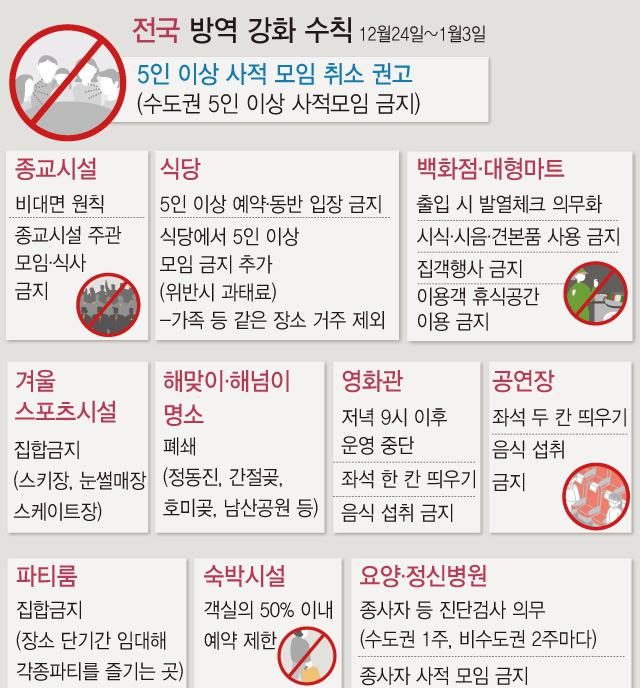 "24일 0시부터 수도권 포함 전국에 적용되는 건 식당에서의 5인 이상 모임 금지다. 이를 위해 식당에 5인 이상으로 예약하거나, 5인 이상이 동반 입장하는 것을 금지한다. 가족 등 주민등록표상 거주지가 같은 사람들이 모이는 경우에는 5인 이상이라도 식당을 함께 이용할 수 있지만 이때도 방역 수칙은 철저히 지켜야 한다."