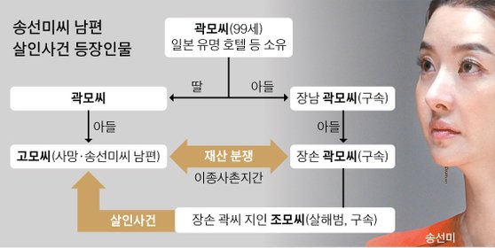 송선미의 남편인 고 씨는 2017년 수백억원의 재산상속 분쟁에 휘말리게 됩니다. 680억원대 자산가인 재일동포 외할아버지의 재산상속을 놓고 외사촌인 곽씨와 갈등을 빚었던 송선미 씨의 남편은 결국 사촌 형 곽모씨의 지시로 청부 살해된 것으로 드러나 많은 사람들에게 충격을 안겼습니다.