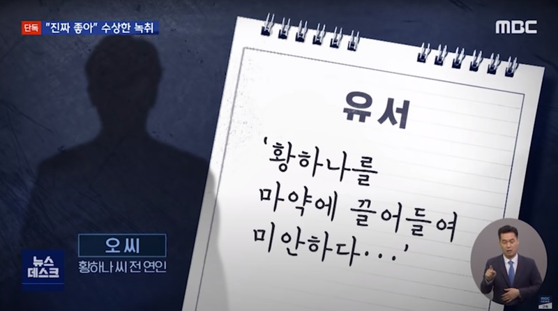 현재 집유기간 중 황씨의 마약투약 혐의를 증언할 핵심 관계자 2명이 자살로 죽거나 중태에 빠진 상황으로 경찰은 이들이 삶을 정리하기 위해 스스로 극단적인 선택을 한것으로 보고 있습니다. 하지만 오씨의 유족과 지인들은 오씨가 절대 자1살로 생을 마감할 인물들이 아니라며 경찰에 재수사를 요구하고 있는 중입니다.