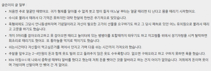구체적인 피해자의 증언을 보면 여지껏 숱하게 터졌던 연예인 관련 학교폭력 사건 중에서도 가장 악질적이라 봐도 부족함이 없을 정도로 충격적입니다