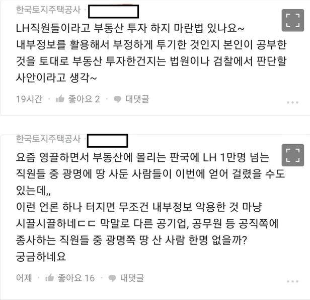 한 LH 직원은 “LH 직원들이라고 부동산 투자 하지 말란 법 있나요”라며 “내부정보를 활용해서 부정하게 투기한 것인지 본인이 공부한 것을 토대로 부동산 투자한 건지는 법원이나 검찰에서 판단할 사안”이라며 블라인드 앱에 글을 게시했습니다.