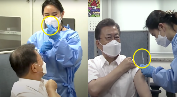 문 대통령 접종 당시 간호사는 먼저 주사기로 아스트라제네카 백신을 소분했고 이어 백신 병과 뚜껑을 제거한 주사기를 들고 가림막(파티션) 뒤로 이동, 병을 내려놓은 뒤 주사기를 들고 나와 문 대통령에게 접종했습니다.