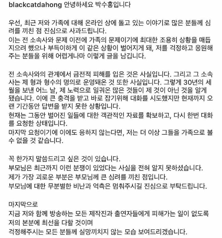 이에 박수홍은 자신의 SNS에 현재 사태에 대한 사실을 인정하는 글을 남겼습니다.