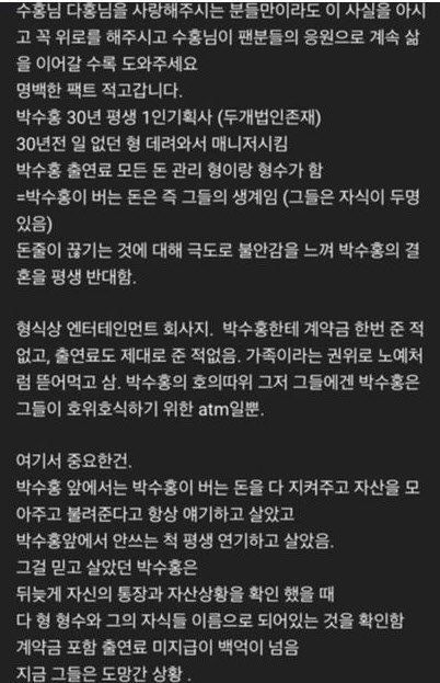 박수홍은 데뷔부터 최근까지 무려 30년에 달하는 긴 방송 생활 내내 친형인 박진홍에게 매니지먼트를 맡겼고, 박진홍은 겉으로는 박수홍을 포함한 모든 가족들에게 박수홍이 벌어온 돈을 안 쓰고 동생을 위해 모으는 척했으나 뒤에서는 그의 아내와 함께 그들 부부 명의의 재산과 부동산들을 따로 축적했으며 심지어 친형의 자식들이자 박수홍의 조카들의 SNS에도 명품으로 치장한 사진들이 가득하다고 하네요