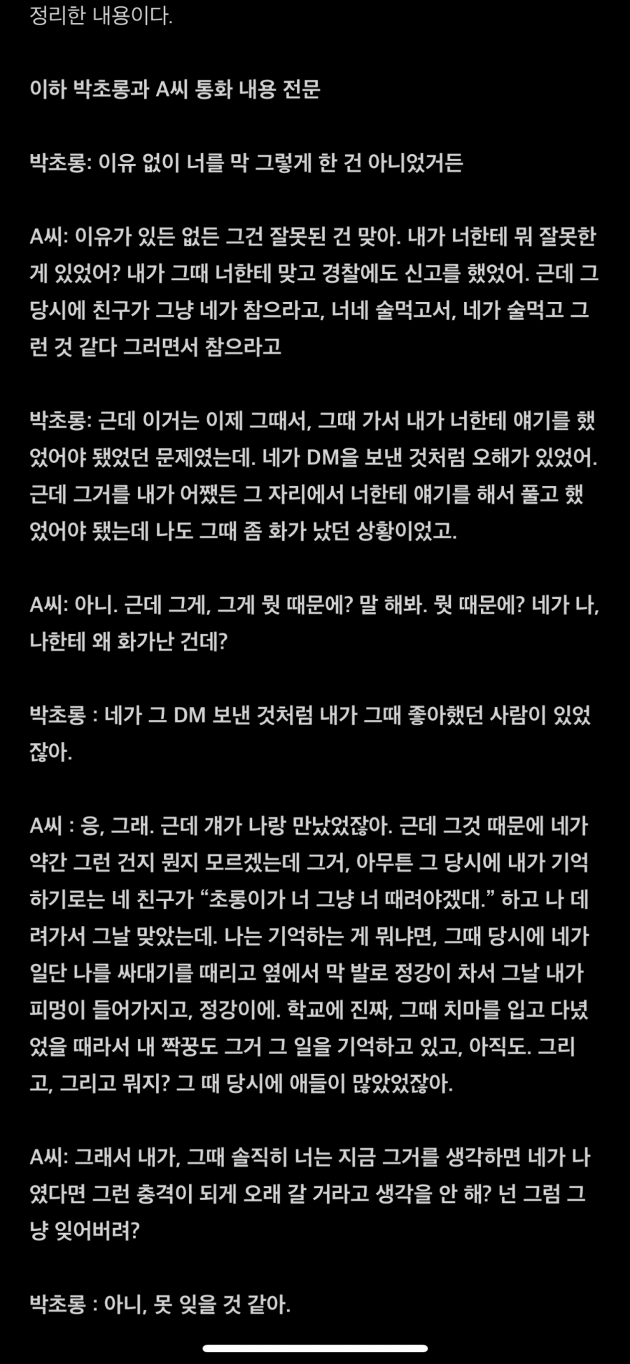 하지만 A씨가 박초롱과 나눈 첫번째 통화 내용에 따르면 박초롱은 ‘왜 자신에게 폭행을 가했냐’는 A씨의 질문에 “내가 좋아하는 사람이 있었잖아” “그떄 내가 좀 화가 났던 상황이었고” “못 잊을 것 같아” 등이라고 답하며 사실상 A씨에 학폭을 가헀다는 걸 인정하는 모습을 보였습니다.