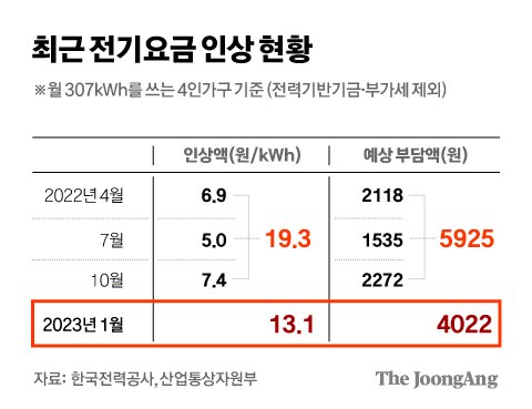 정부는 지난해 말 한전의 자금난 해소를 위해 2023년 전기요금 인상분을 kWh당 51.6원으로 산정하고, 올 1분기 전기요금을 kWh당 13.1원 올렸기 때문에 이에 따라 2∼4분기에도 비슷한 폭의 인상이 각각 이뤄질 것이라는 관측이 나온 것입니다.