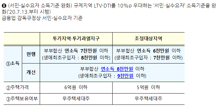 - 규제 지역 내 LTV, DTI 10% 우대를 위한 서민, 실수요자 소득기준을 완화한다