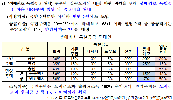 - 생애최초 특별공급 중 국민주택은 20%에서 25%로 확되하며 민간주택은 7%~15%로 의무배정한다.