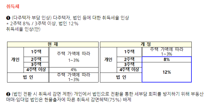 - 취득세 : 다주택자, 법인에게 포커싱된 취득세 인상. 2주택 이상 시 개인의 경우는 무조건 8%, 3주택부터는 12%, 법인의 경우 일괄세율 12% 적용.