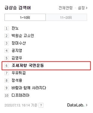 이날 오후 3시 30분 기준 네이버에서는 '조세저항 국민운동'이 실검 1위를 차지했는데요. 해당 캠페인은 617 부동산대책에 반대하는 네티즌들을 중심으로 지난 1일부터 진행되고 있습니다.