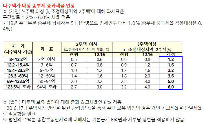 - 종부세(종합부동산세) : 3주택 이상이나 조세대상지역 2주택 이상의 다주택자에 대한 종합부동산세 세율 상향 조정