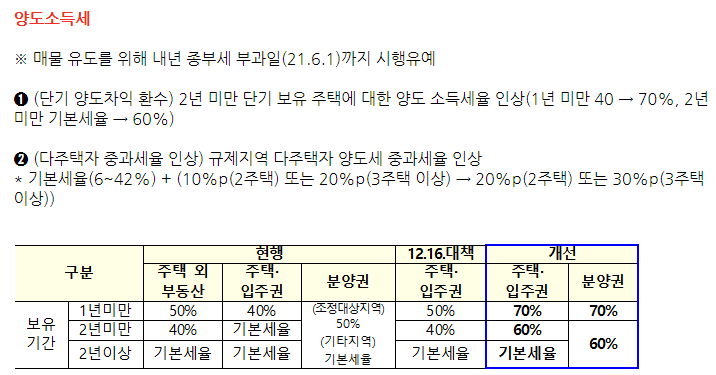 - 양도소득세 : 내년 이후부터 2년 미만 보유 시 양도세 부담이 기존 대비 상향. 다만, 최고 세율은 70%. 분양권의 경우 2년 이상의 경우에도 등기시점 전까지 무조건 60% 과세, 분양권 단기 매매 시 1년 미만은 50%에서 최고 70%까지 인상되어 지방세를 감안한다면 약 80%에 가까운 세금폭탄 예상